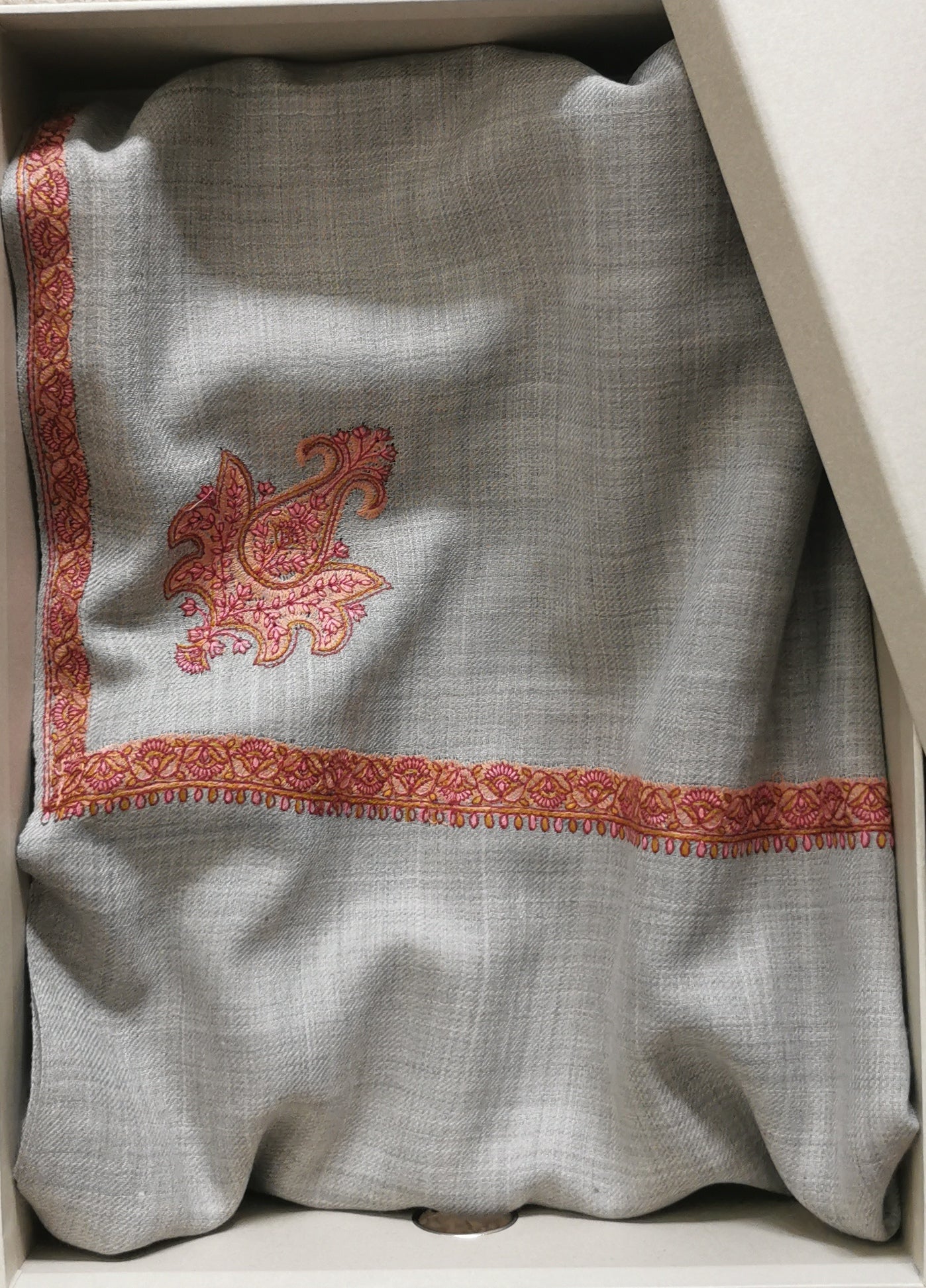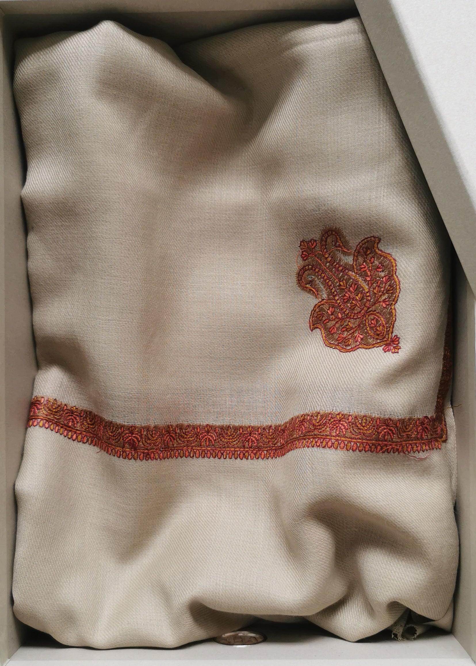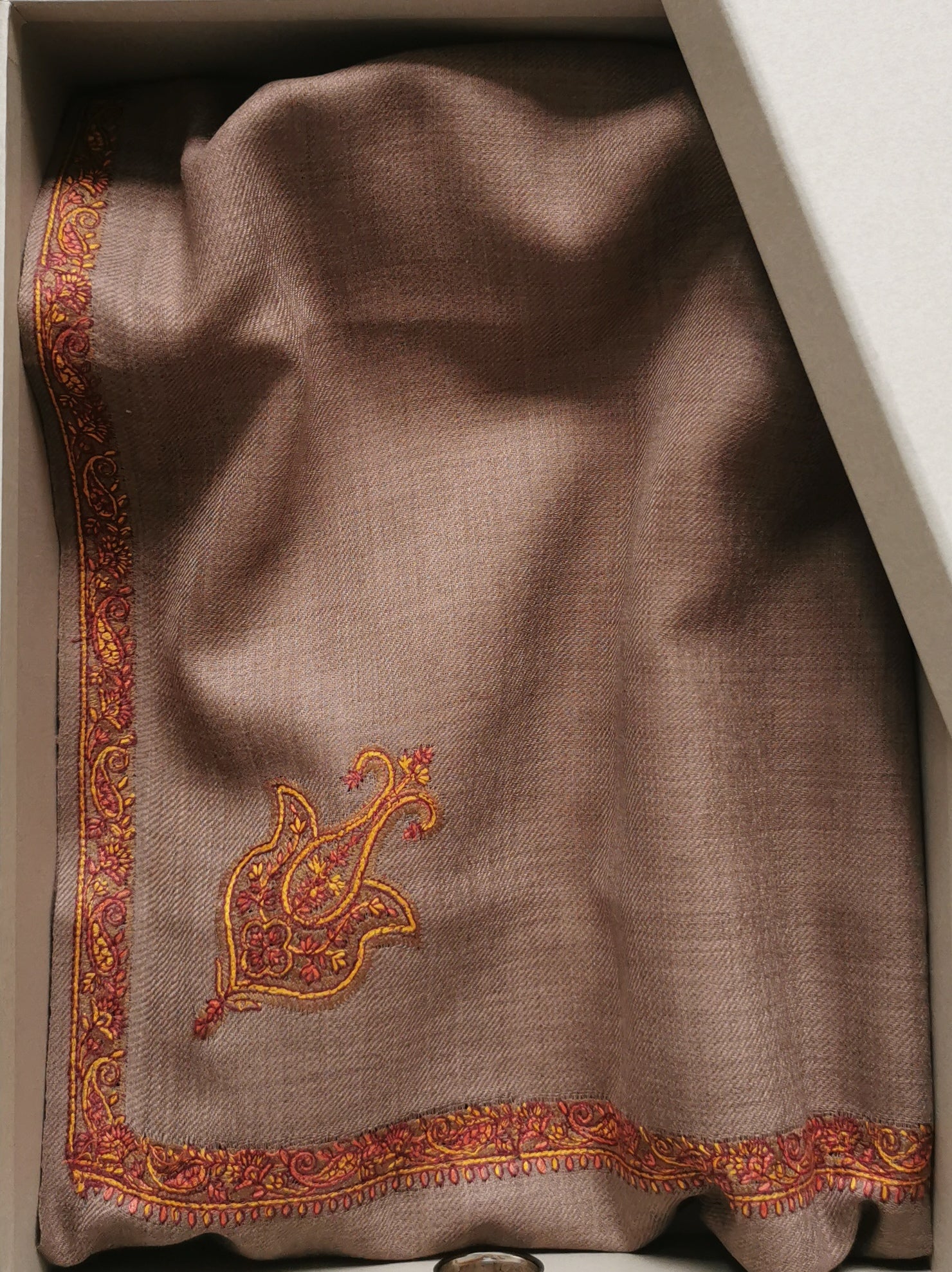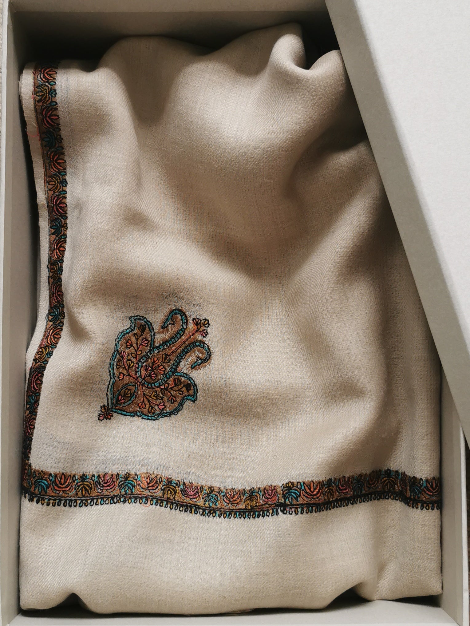 Our Basics Collection Shawls are a blend of wool and polyester. With a soft feel and semi hand embroidered borders, they are perfect for everyday wear as well as for special occasions.