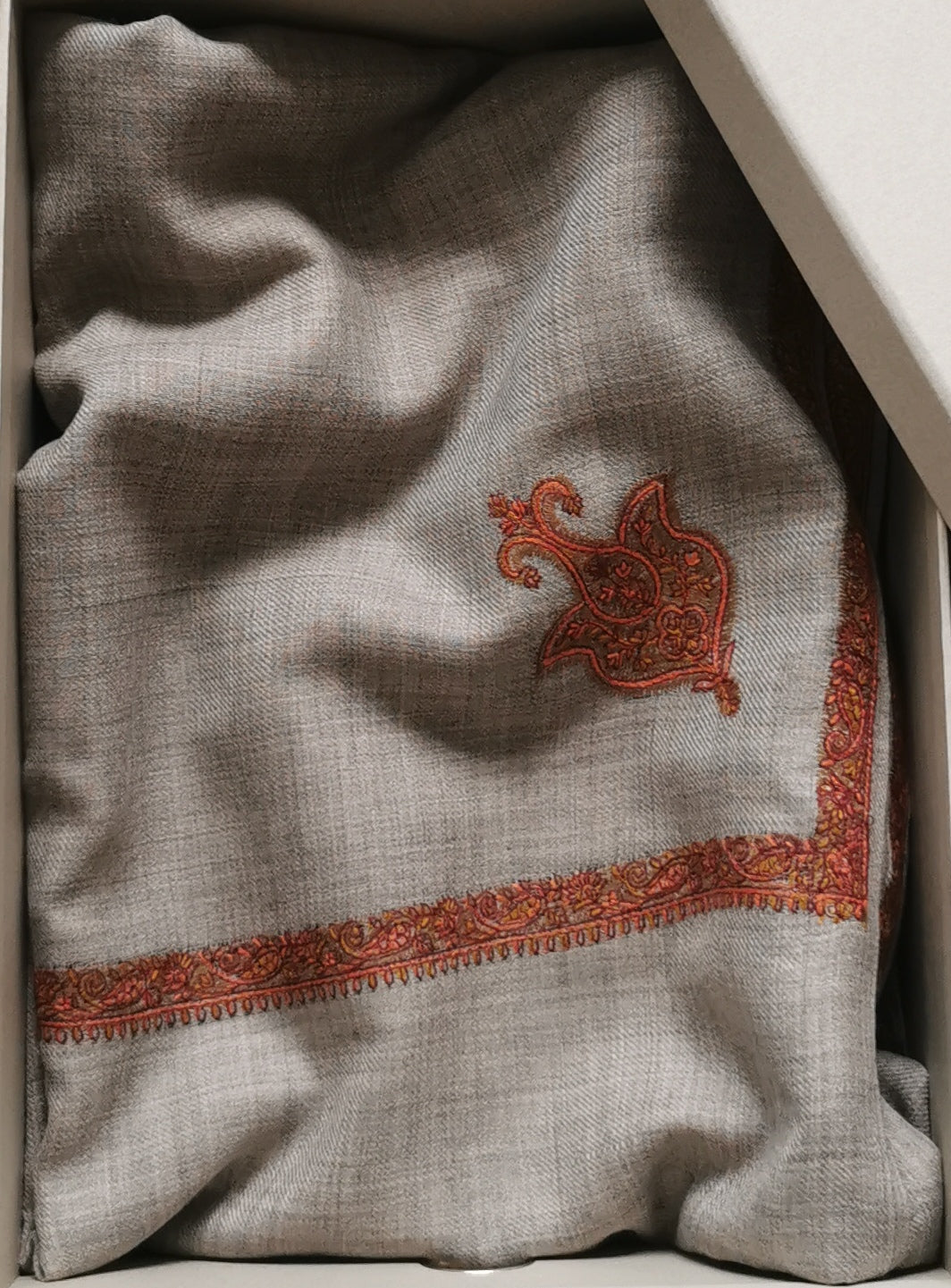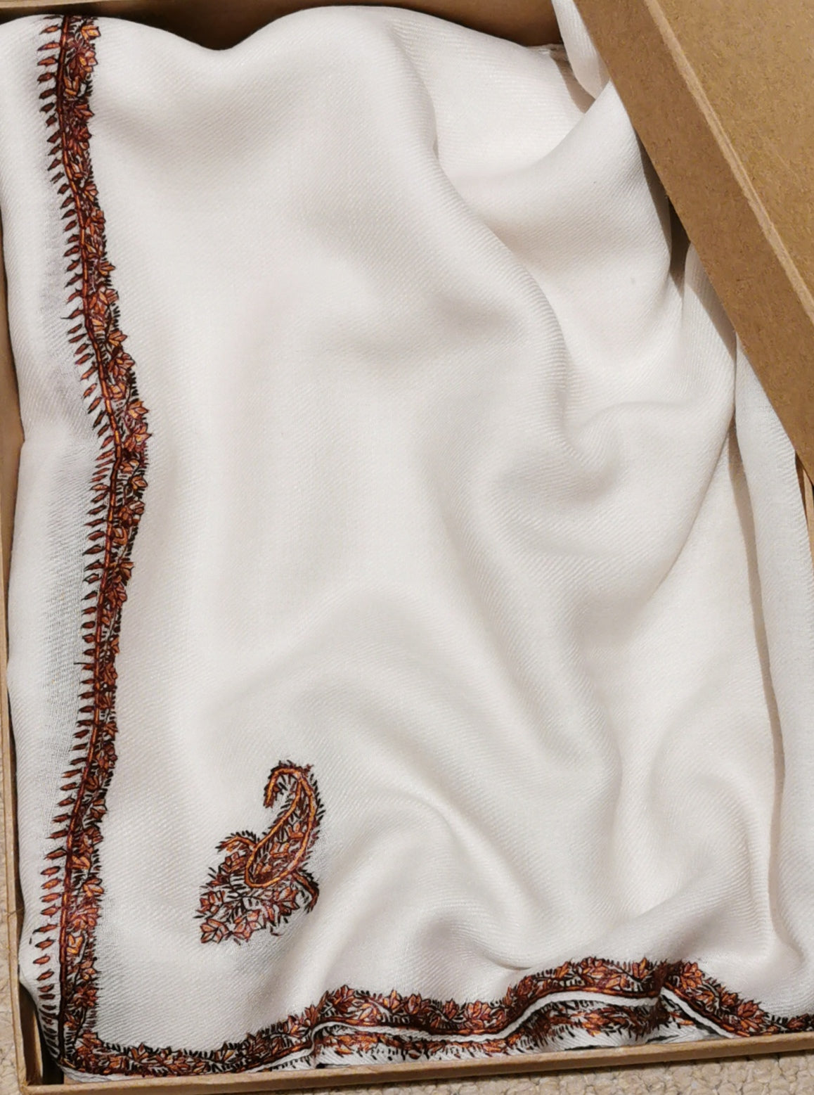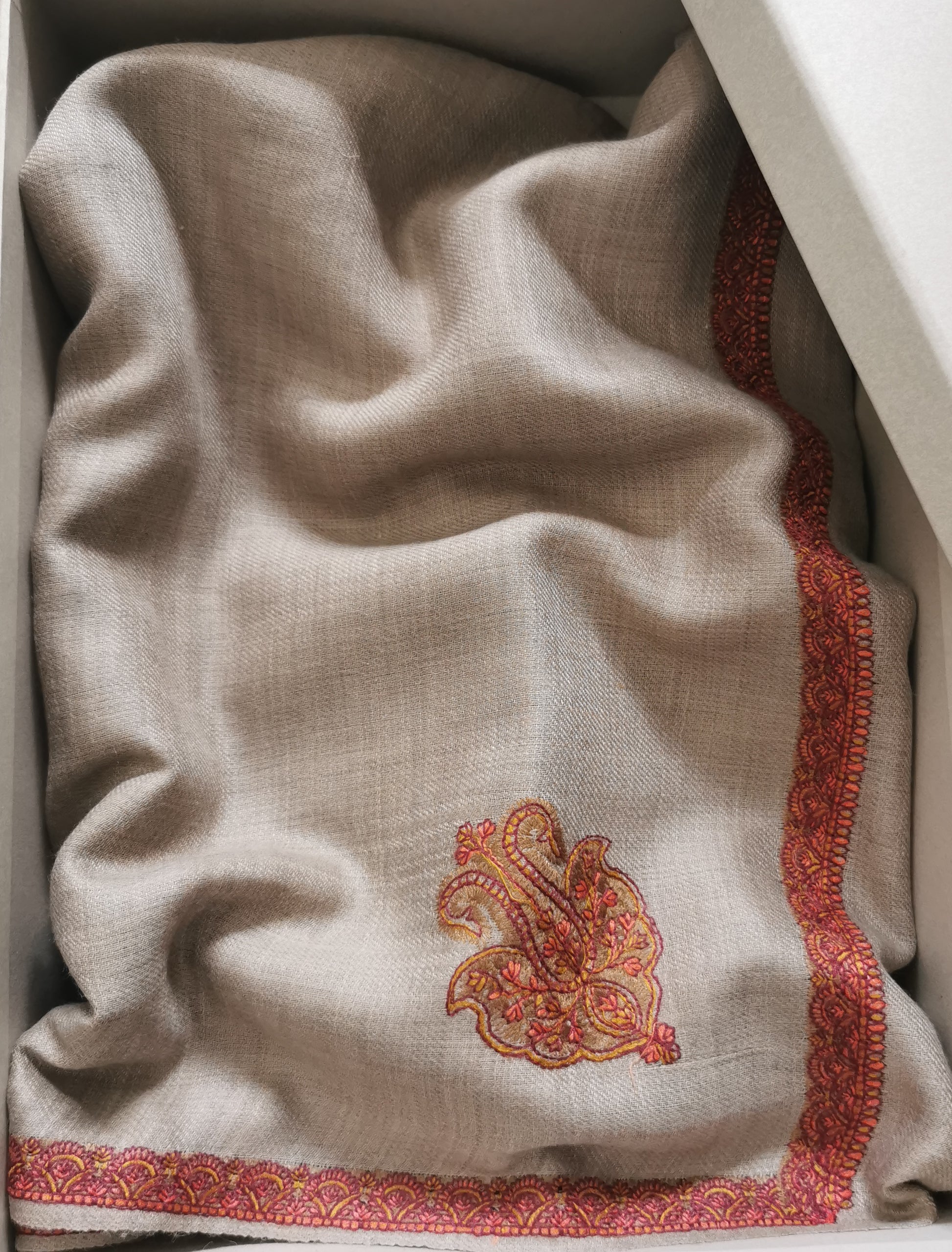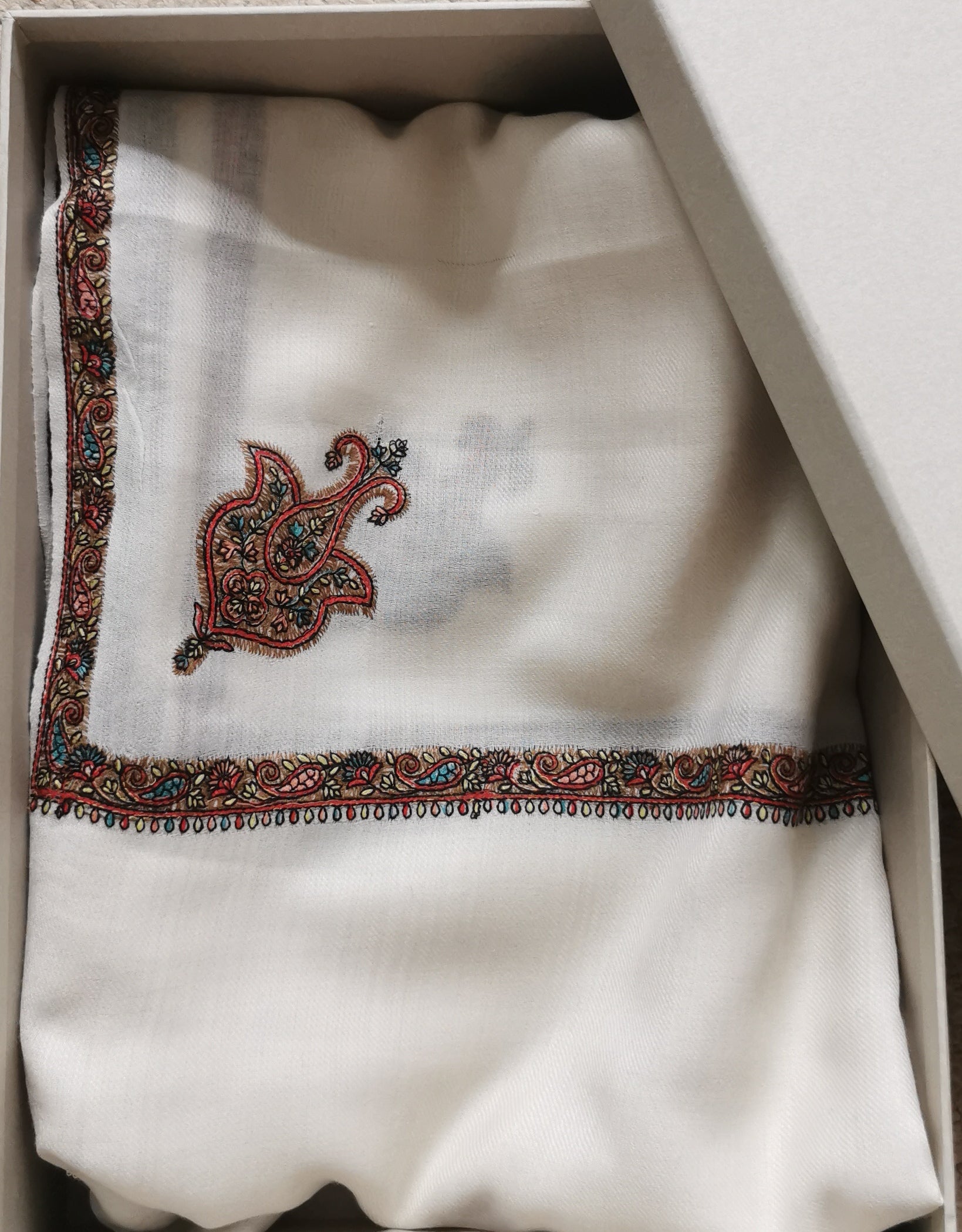 Our Basics Collection Shawls are a blend of wool and polyester. With a soft feel and semi hand embroidered borders, they are perfect for everyday wear as well as for special occasions.