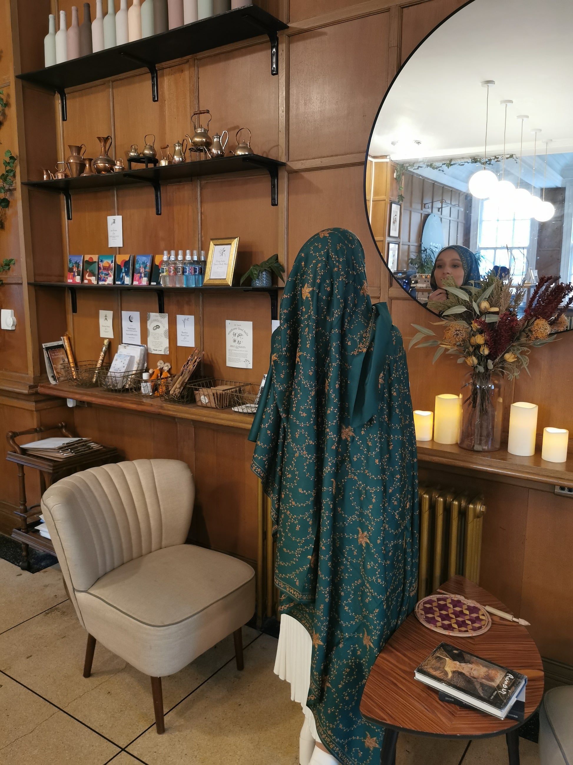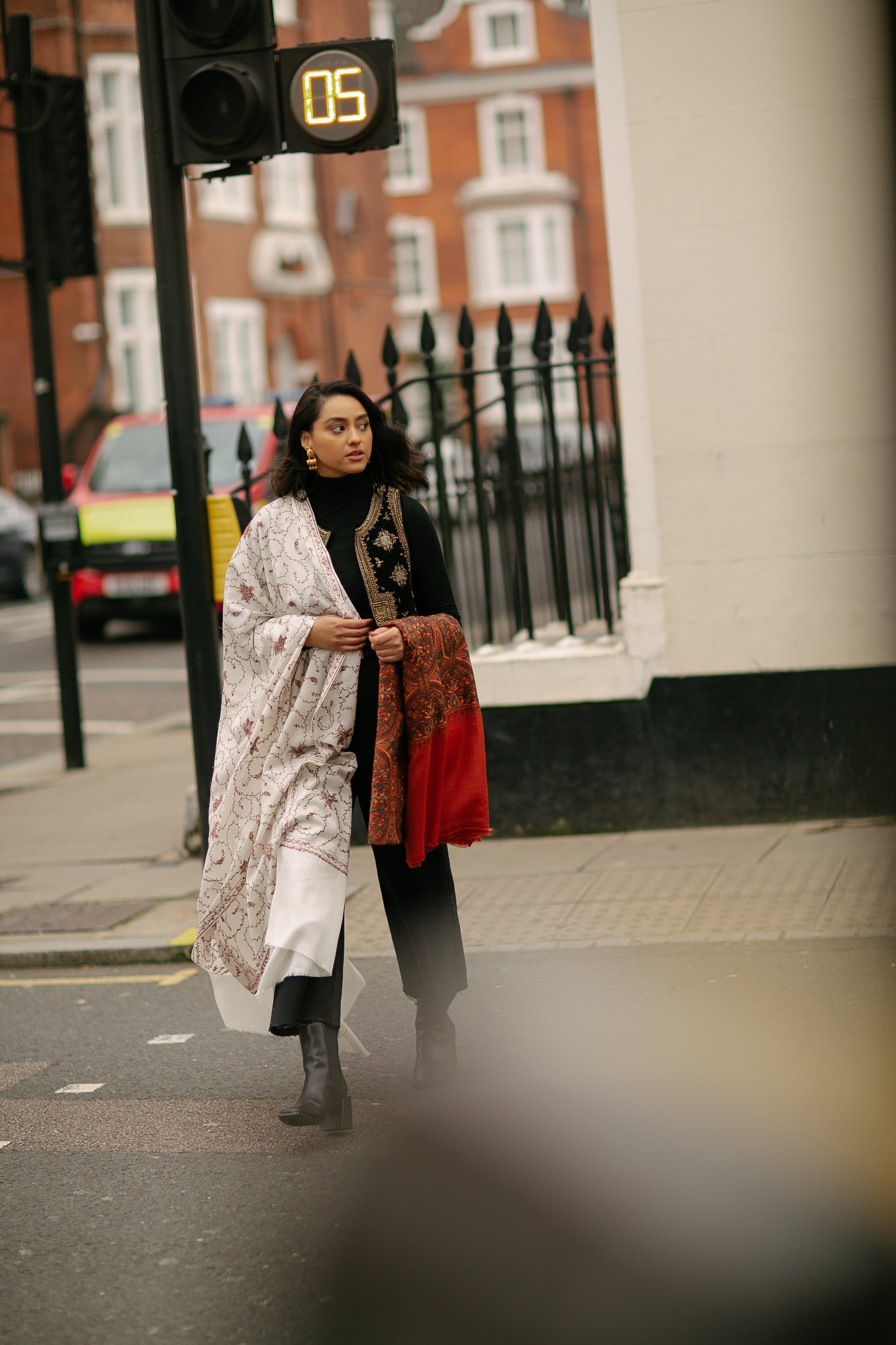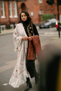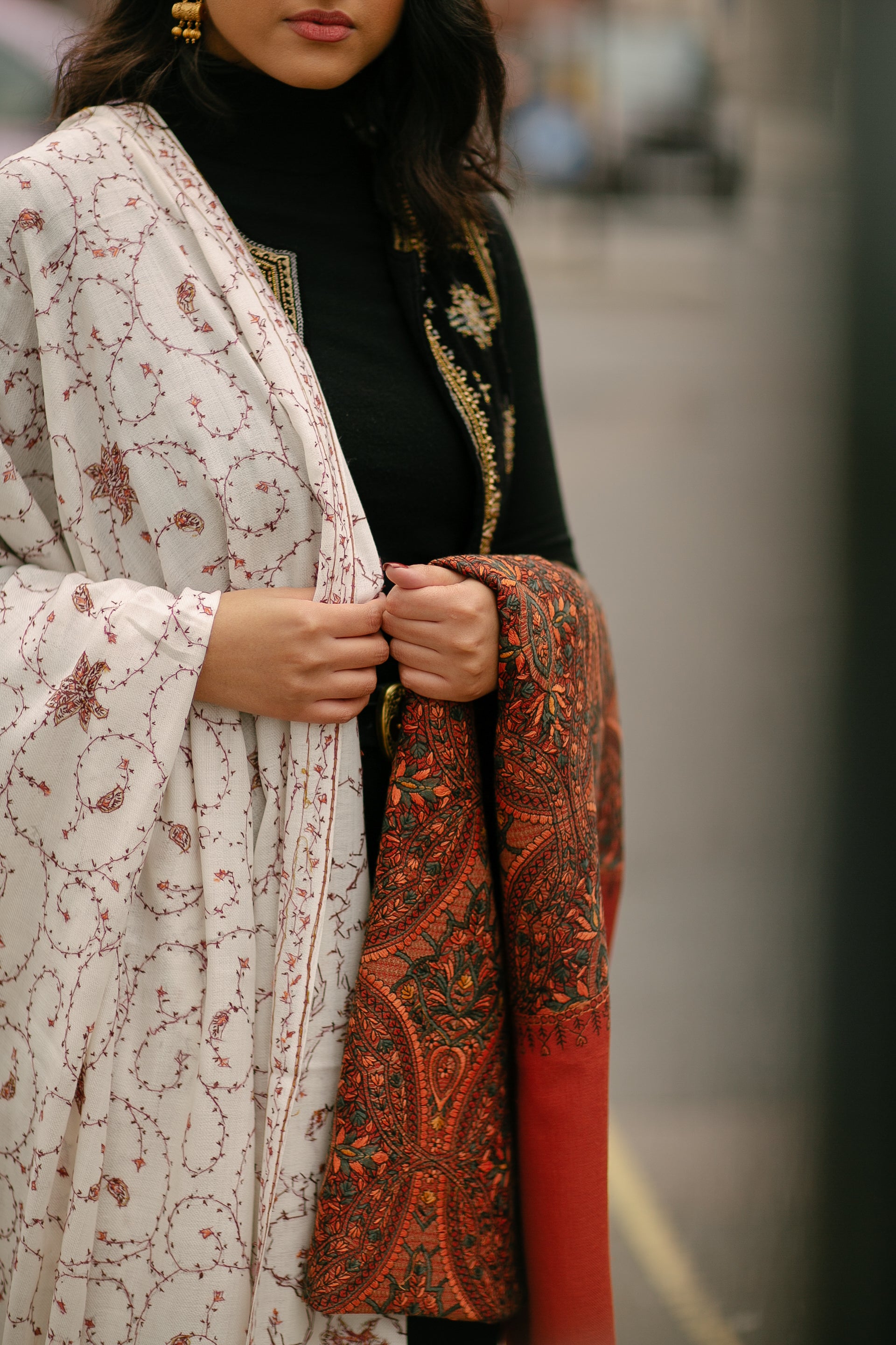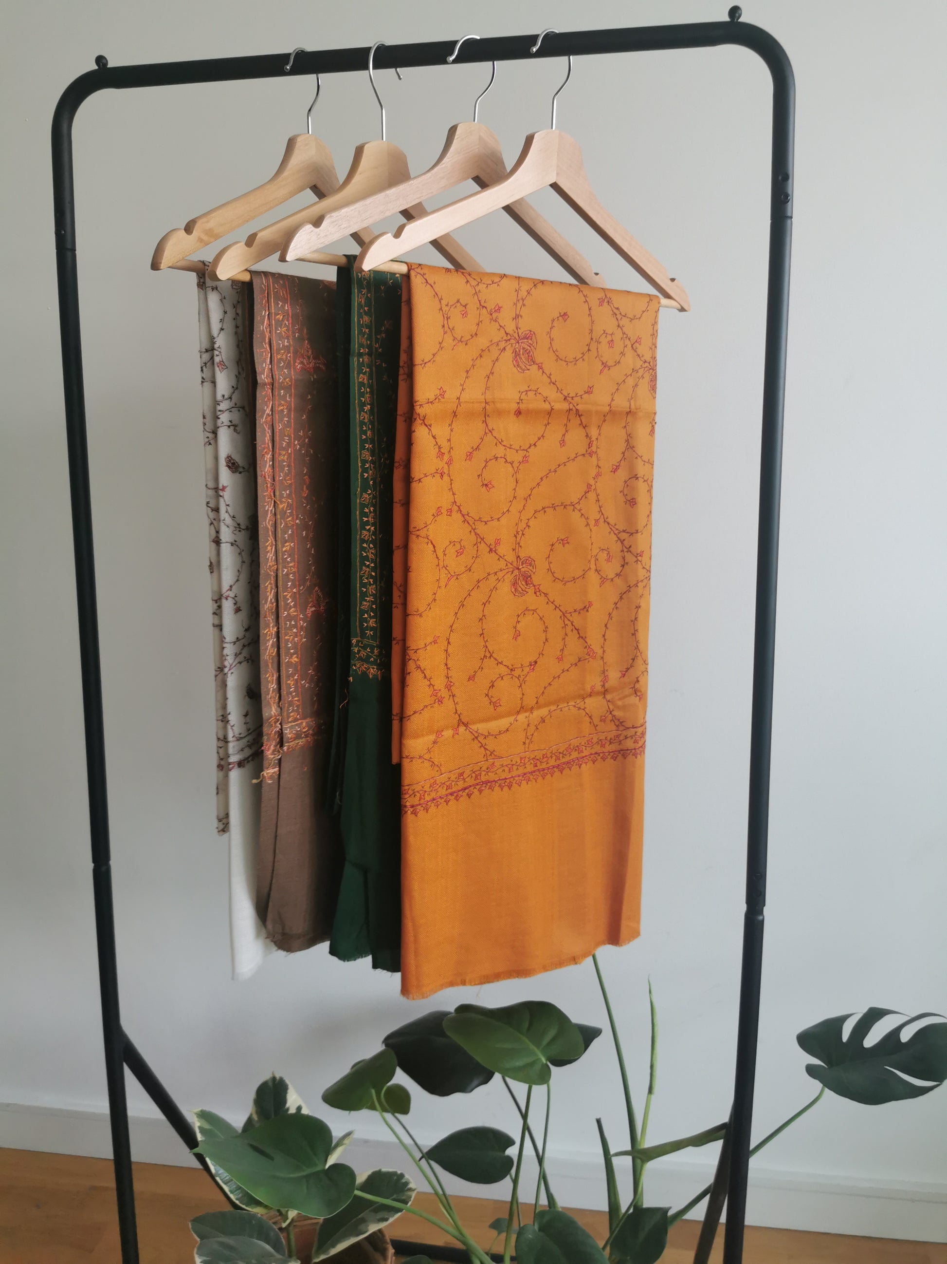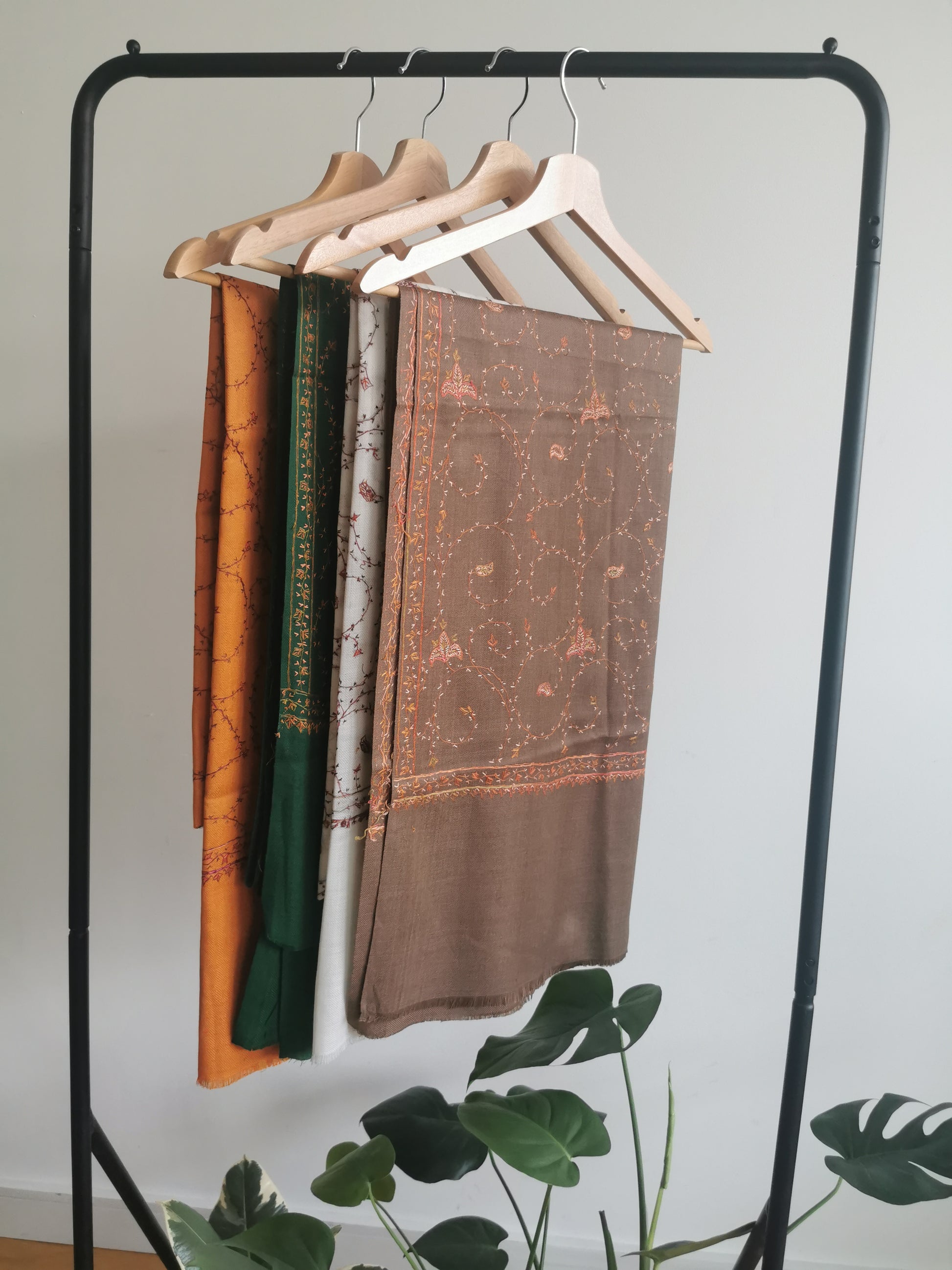 Hand embroidery done all over the shawl and stole. Model is wearing the shawl size.