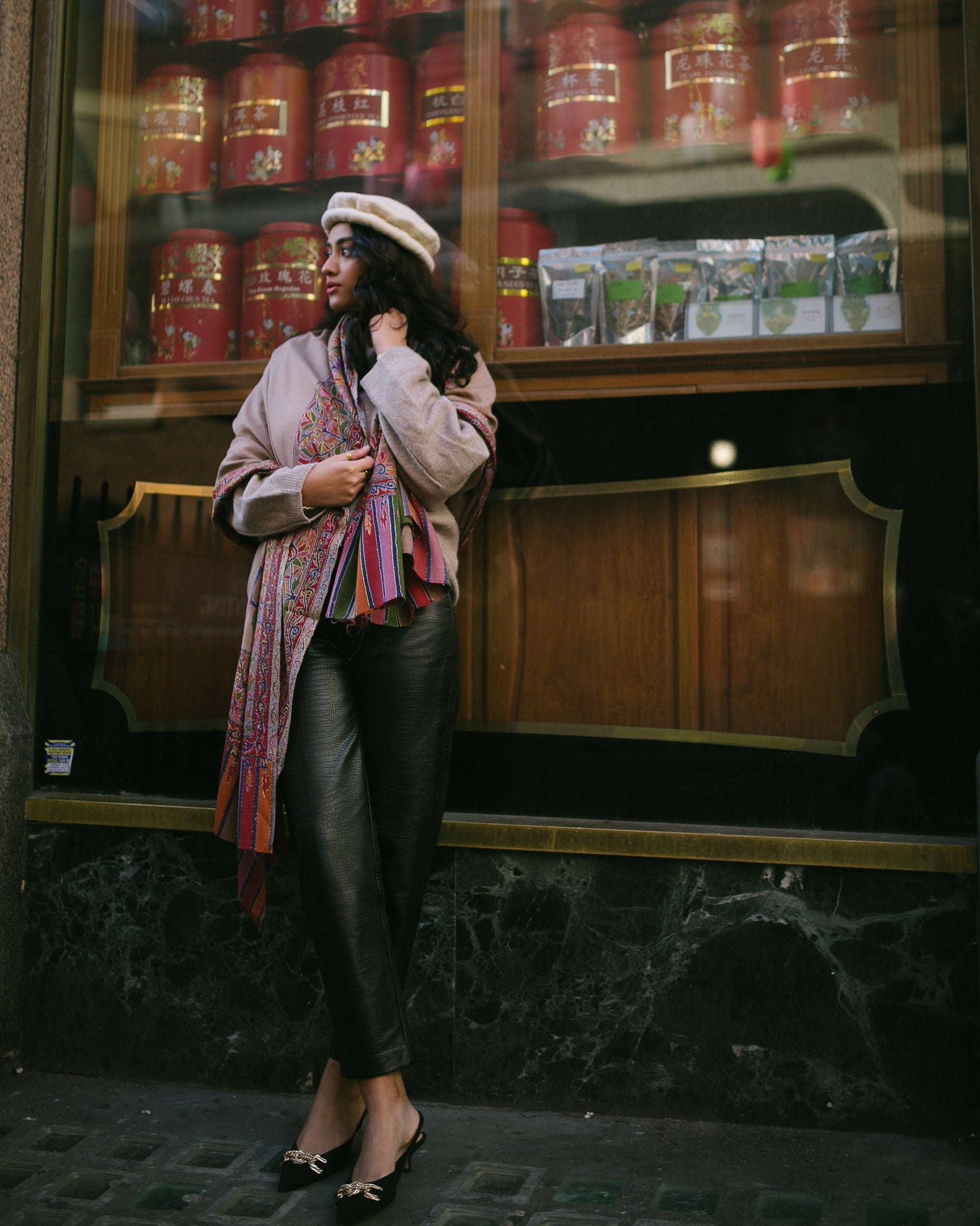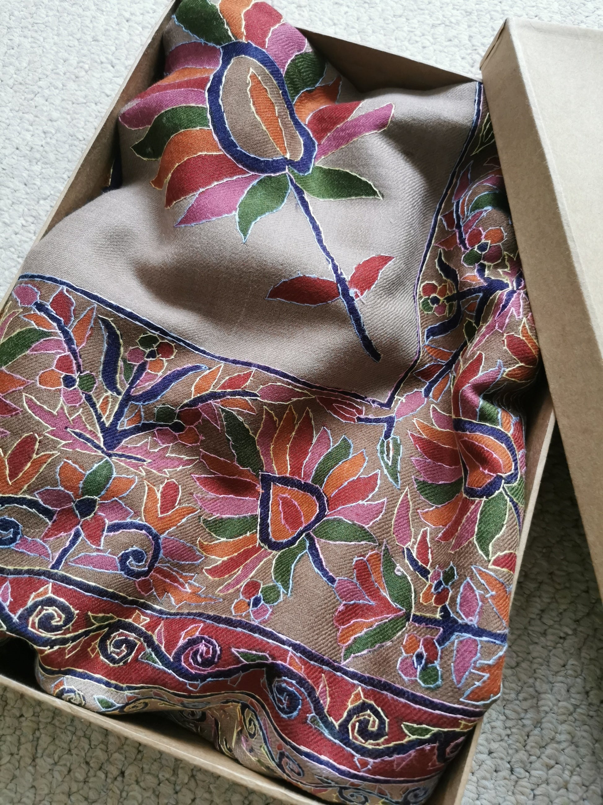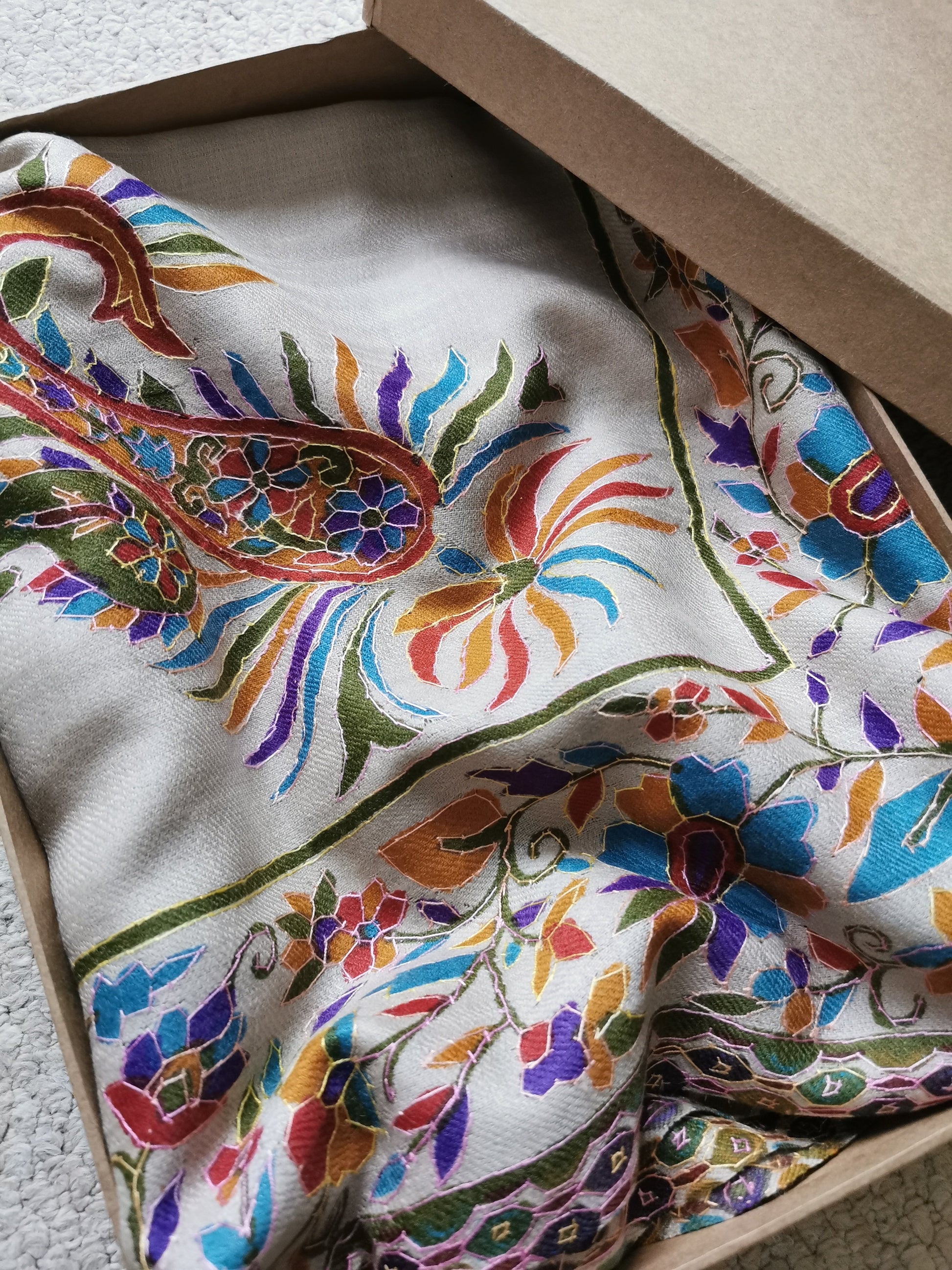 The borders of these shawls have been hand painted and given finishing touches by hand embroidery.