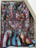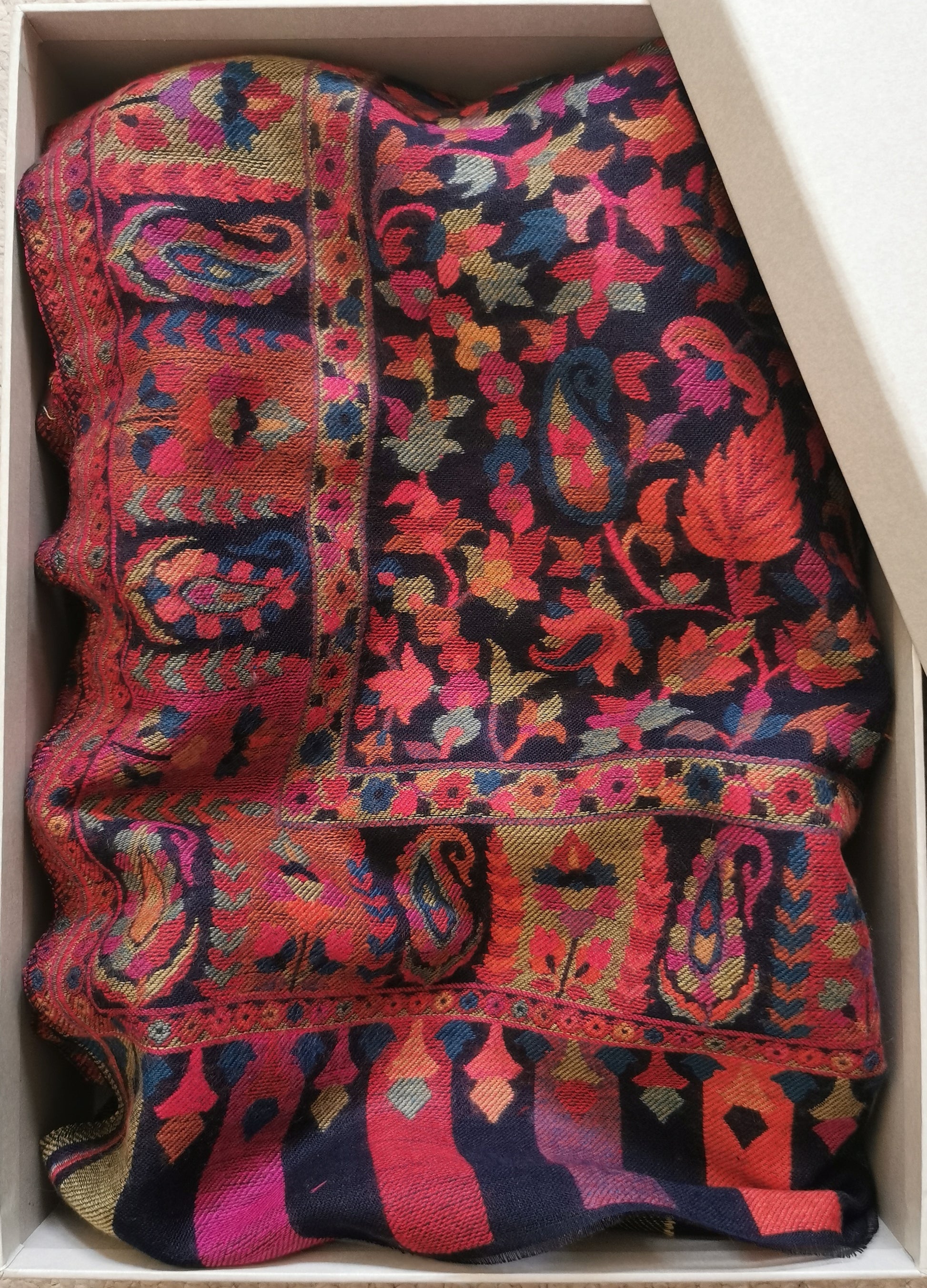 A Kani shawl is a type of Kashmir shawl originating from the Kanihama area of Kashmir. The shawls are woven from pashmina yarn. Kani shawls use needles made from cane or wood. The distinguishable, Mughal patterns, usually of flowers and leaves, are woven into the fabric like a carpet, thread by thread, based on the coded pattern called 'Talim'.