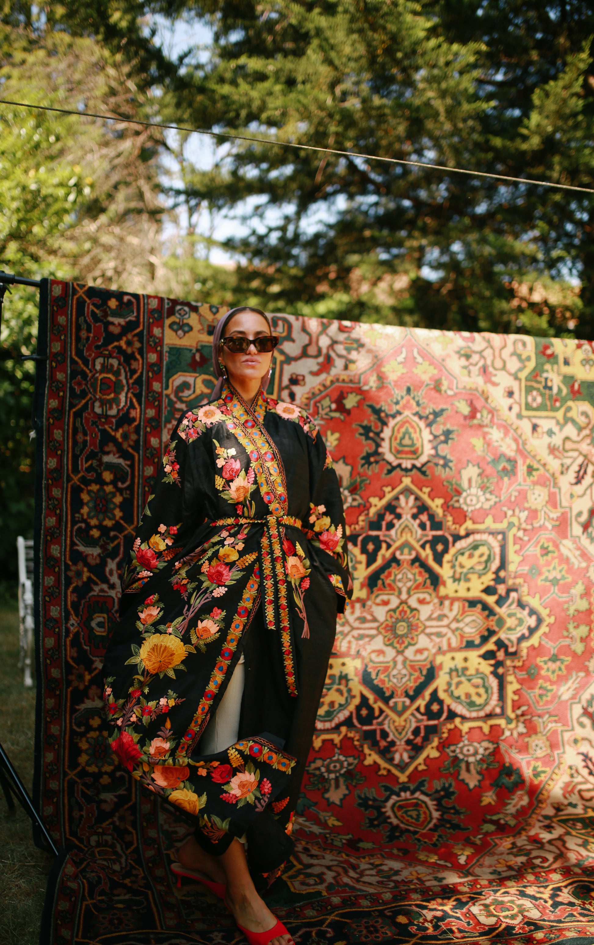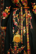 Our Aari embroidered, raw silk Kashmiri gowns are free sized and can be adjusted by tightening or loosening the belts stitched on the inner part of the dress.