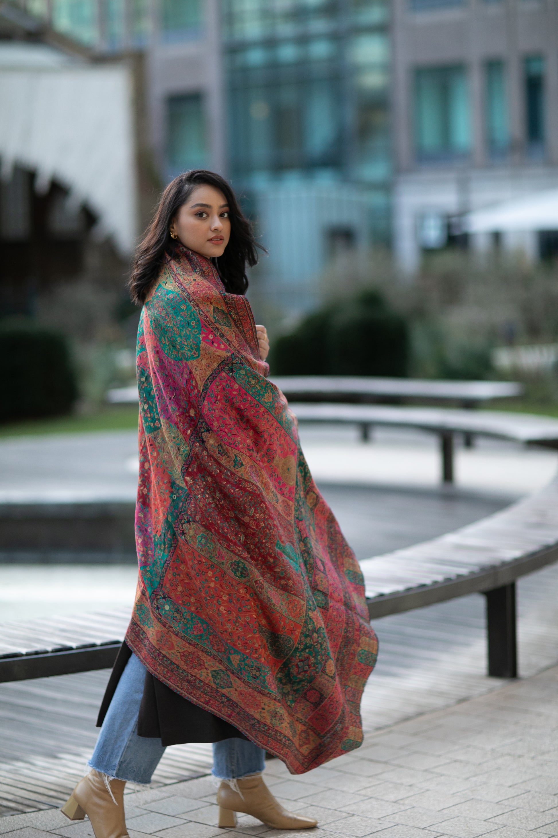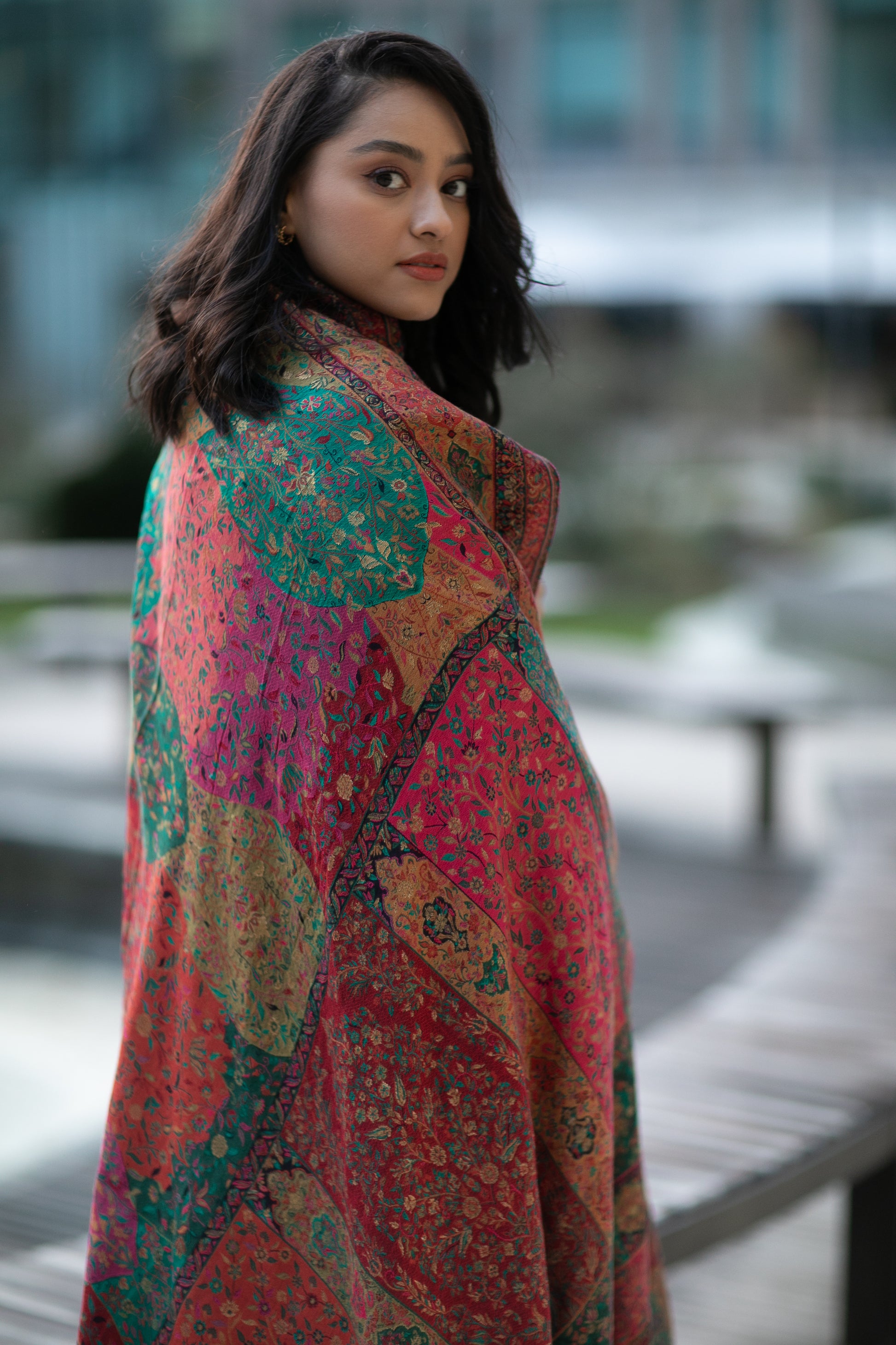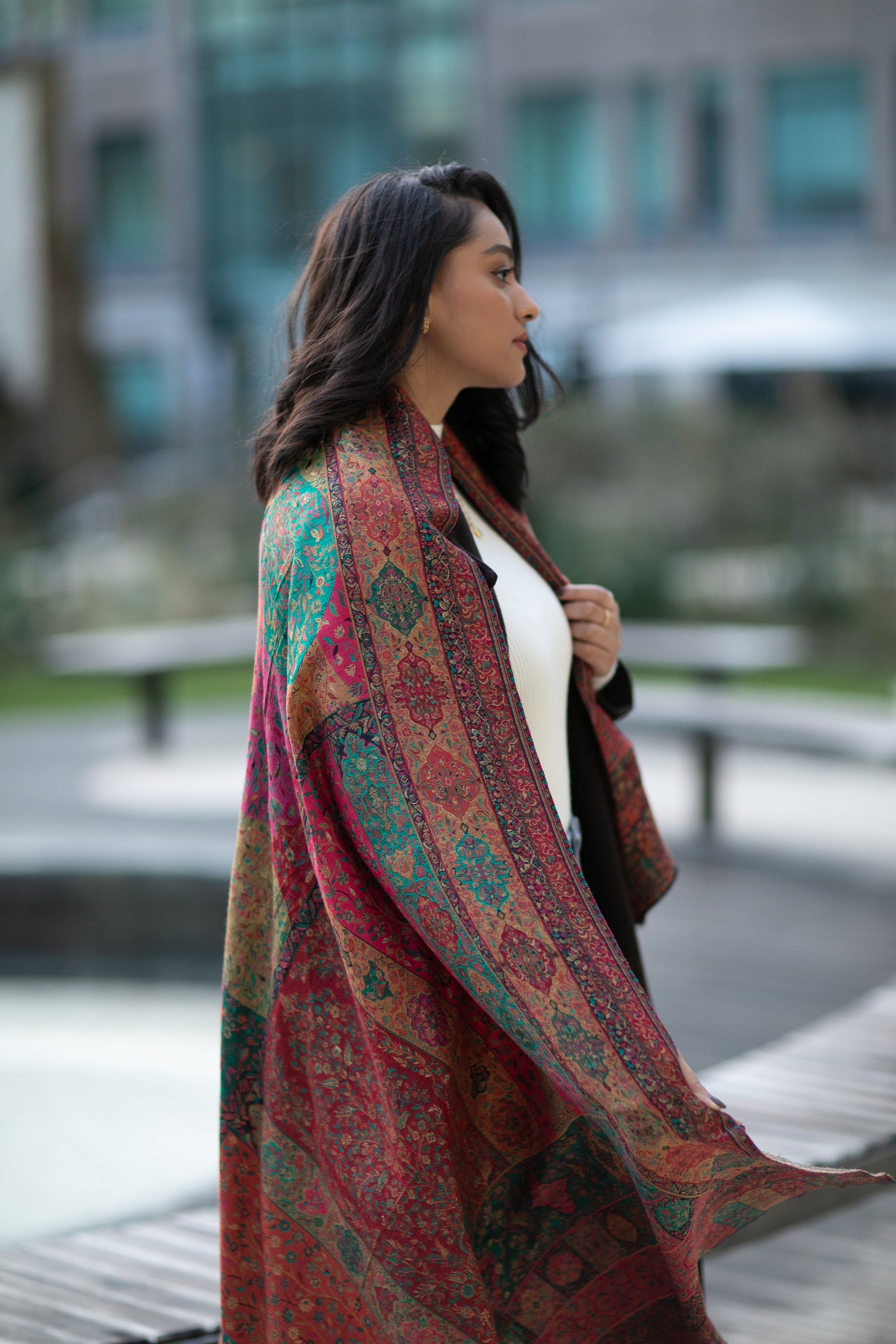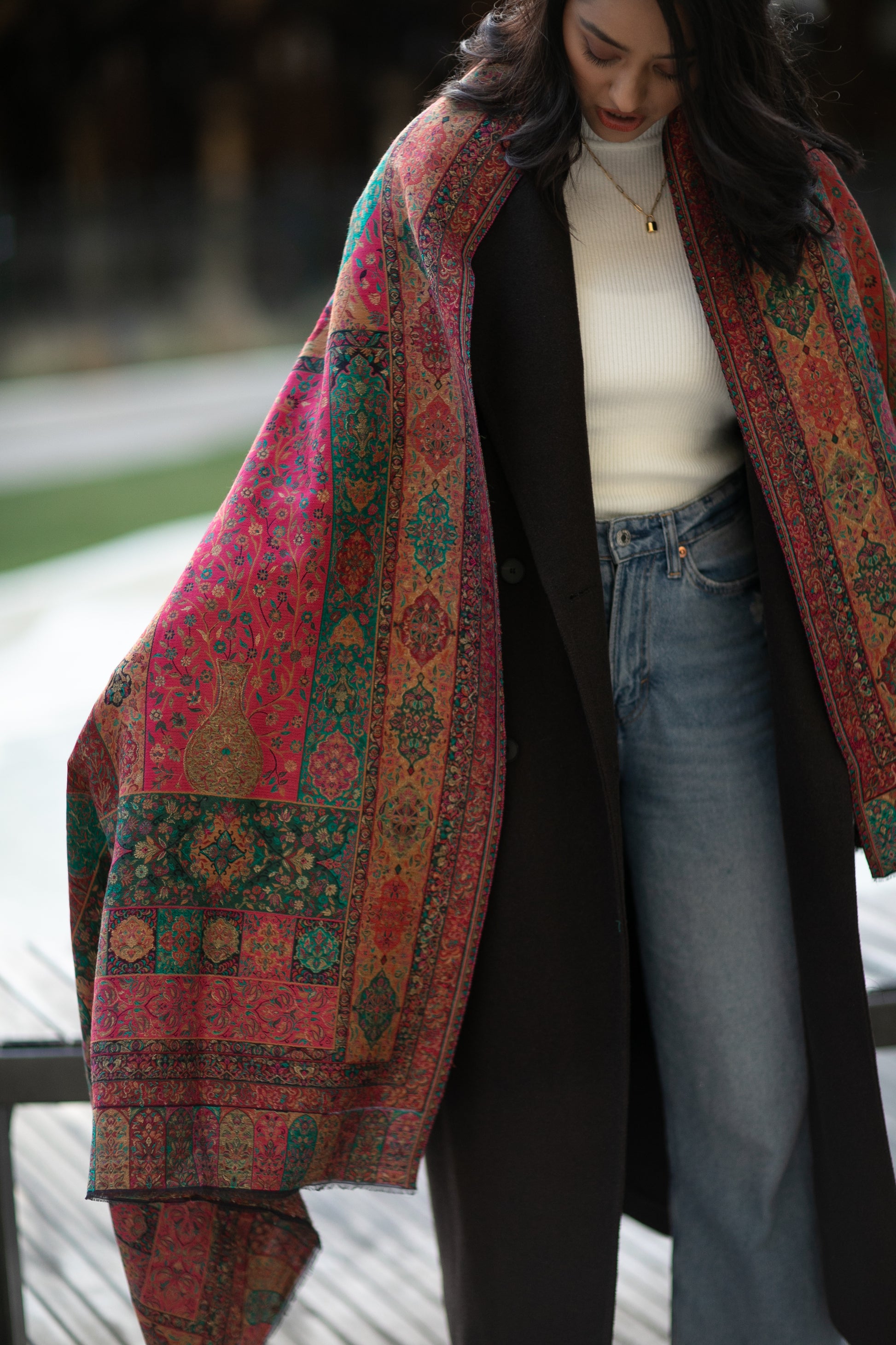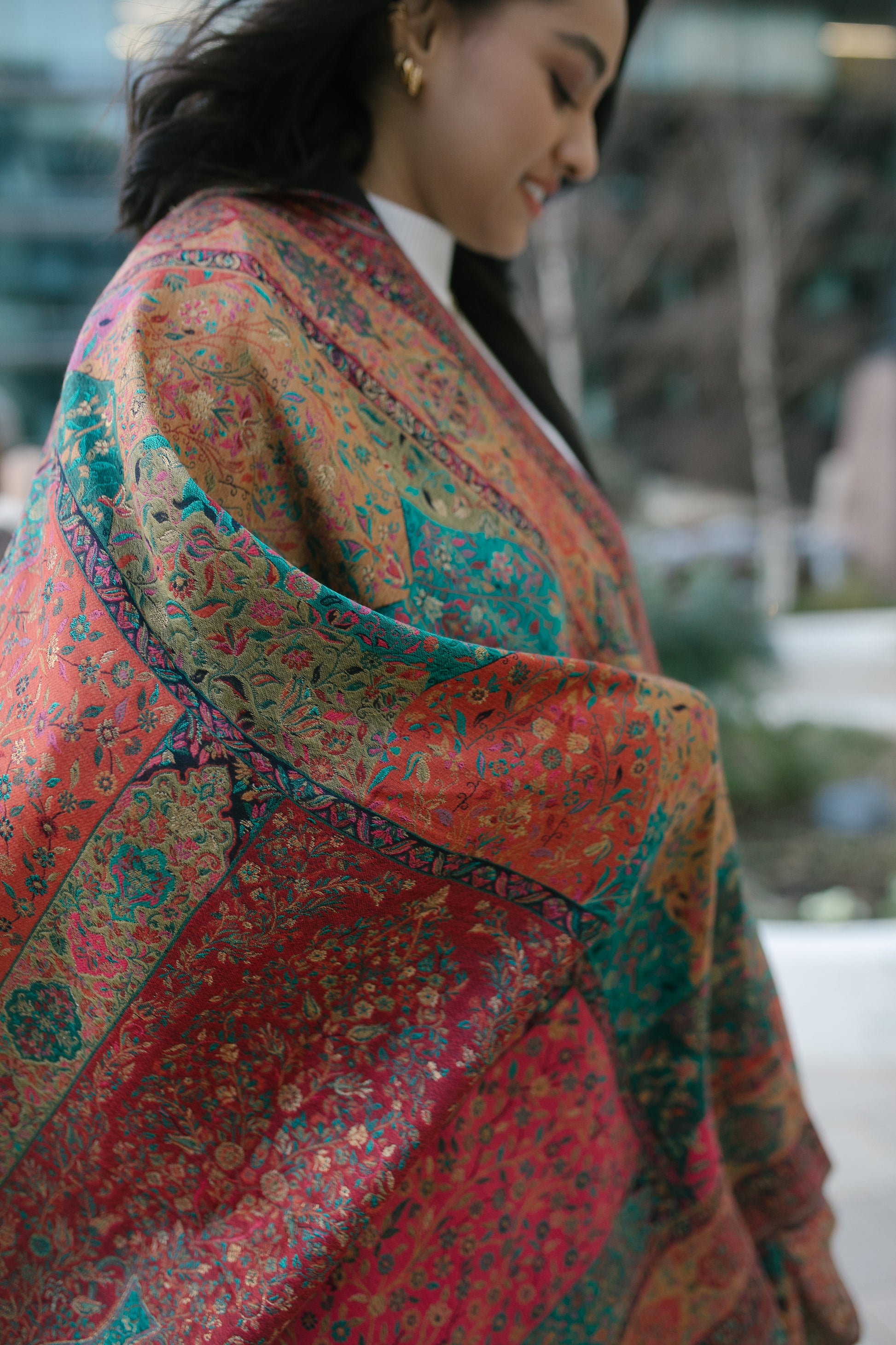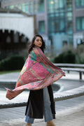 Intricate woven Kani shawl with zari thread-work combined with wool.